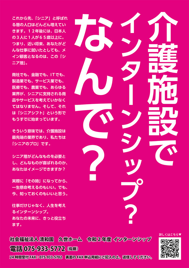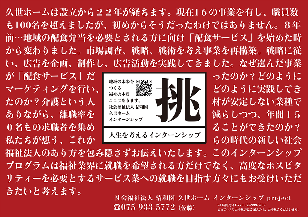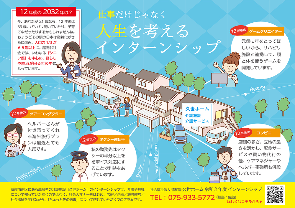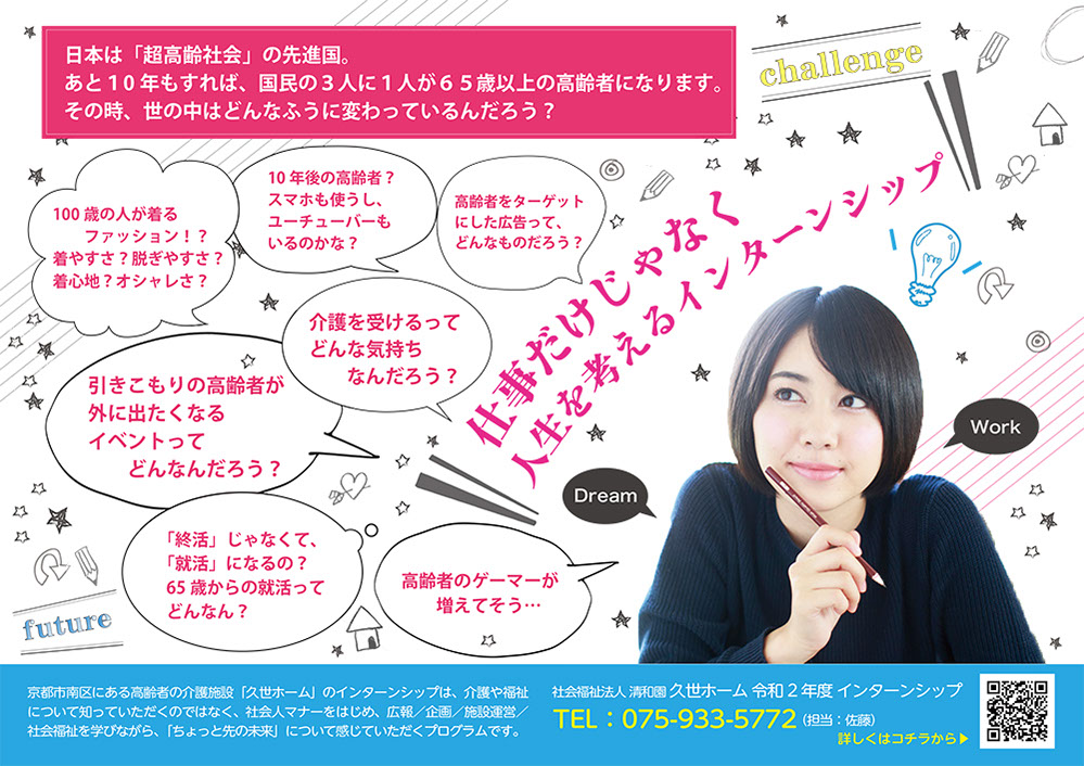 京都市南区にある高齢者の介護施設「久世ホーム」のインターンシップは、介護や福祉について知っていただくのではなく、社会人マナーをはじめ、広報/企画/施設運営/社会福祉を学びながら、「ちょっと先の未来」について感じていただくプログラムです。